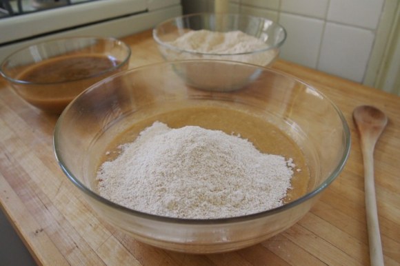 add some of the dry ingredients to the wet ingredients and incorporate.