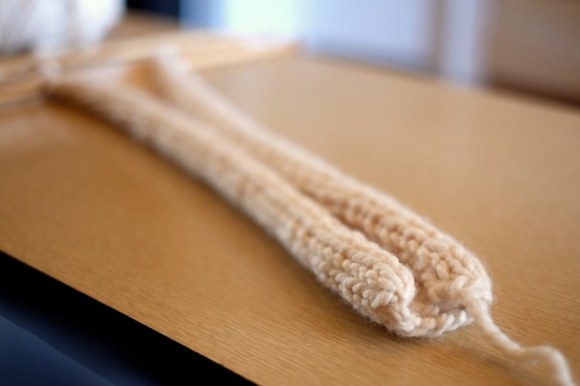 My sister taught me how to knit for christmas (thank you!), and serious practice was needed before using an expensive yarn. This proto is 80% acrylic and 20% wool, knit in a stocking stitch with a german slip stitch selvedge edge. After a dozen swatches, I went whole hog and knit up the entire skein. Good thing too- none of the small swatches had curled at the edges, but the scarf was a hot mess.
