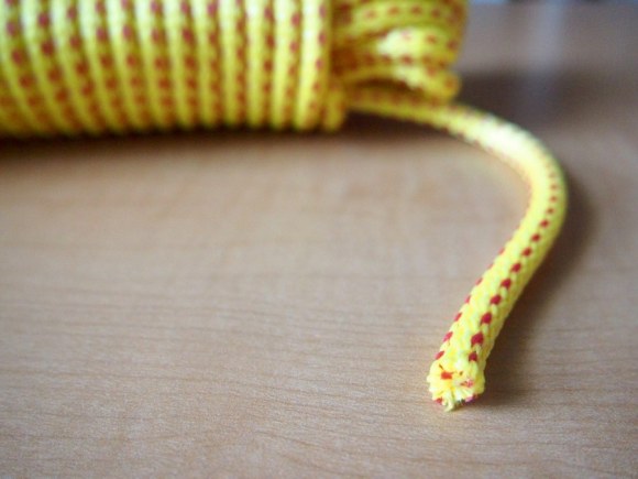 - cut the rope longer than what will fit around your wrist. at one end, use the lighter to melt the ends, ever so slightly. carefully pinch the tip together while it's warm (i did burn my fingertips, being impatient). keep lighting up and pinching the end until it fits snugly into the toggle's end cap.