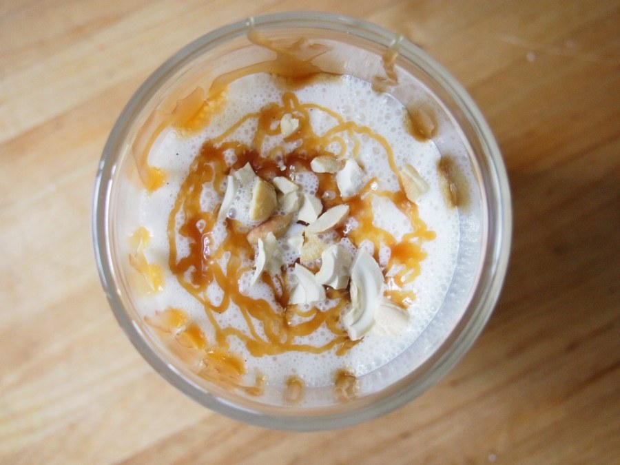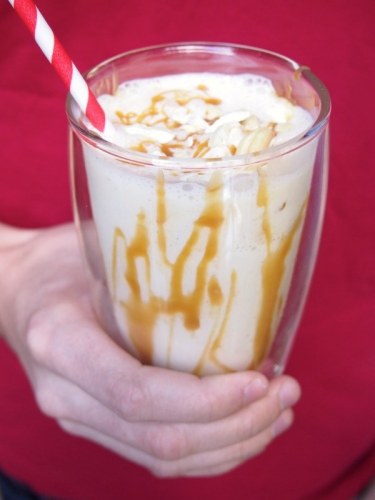 - drizzle caramel on the sides of the glass. pour in shake, add another drizzle of caramel, and the toasted nuts.