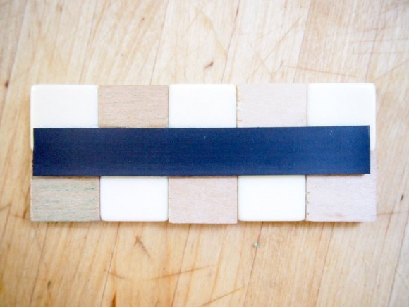 - cut the magnetic strip slightly shorter than the tiles. center the magnet on the reverse side of the tiles, and glue in place. cover the surface of the magnet with a strip of clean wax paper, and place heavy books on top. let magnet dry completely overnight.