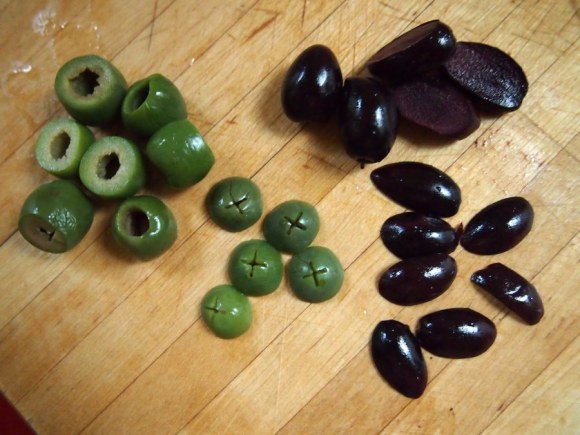 - with a plastic straw, poke out a hole in the center of each castelvetrano olive slice. poke some pupils out of the kalamata olive slices, and fit them into the holes in the green olives.