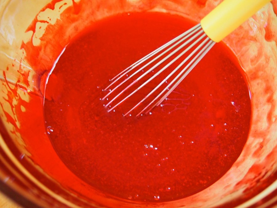 - pour karo syrup into a deep bowl (spout helps). whisk in food coloring until syrup is a bright deep red. add sifted cocoa powder, 1 Tbl at a time, until syrup turns a realistic shade of blood red. sifting is important, because it's hard to whisk out the lumps.