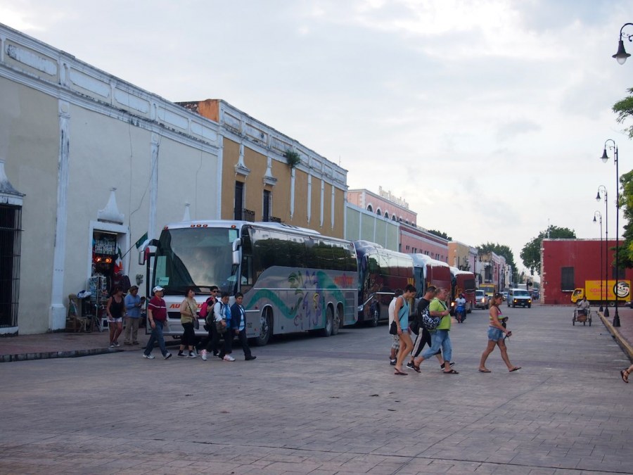 upon arrival in valladolid at 9:30am, we were very obviously some of the only tourists in town. and rarely did we cross paths with other americans throughout the day. but around 3pm, all that changed. huge busses started filling up every street- i'm guessing on their way back to cancun from chichen itza. not just a few busses either- at least a dozen, all at once. hundreds of disinterested, tired, cranky, tourists hit the town, and it became real clear who was running the show now: