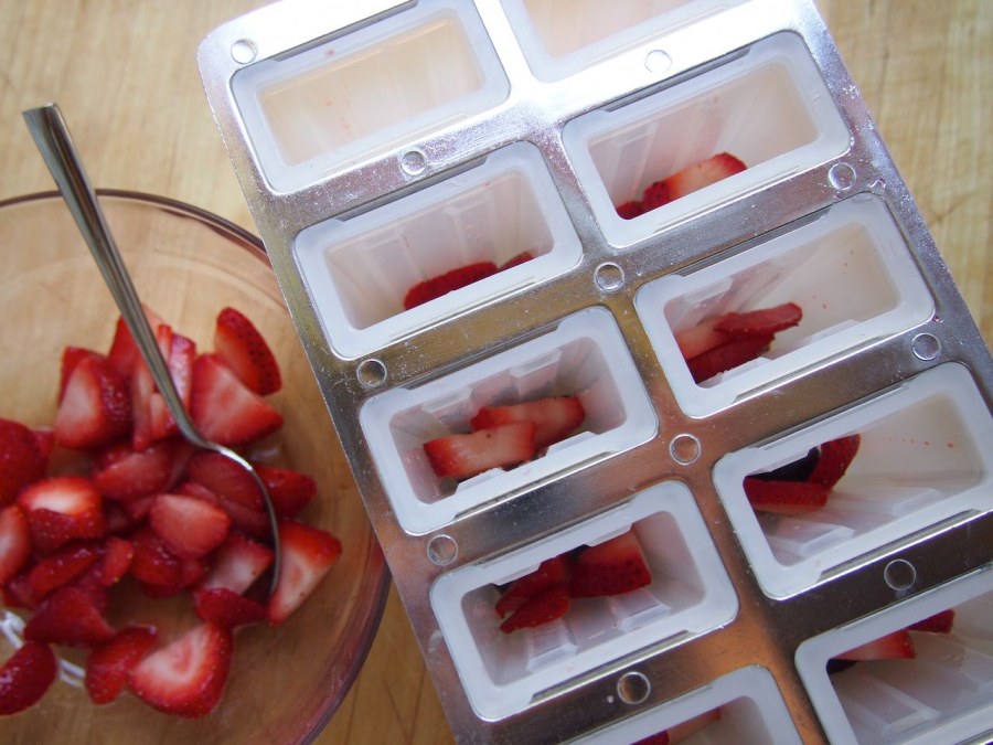 - drop the fruit into the popsicle mold. i layered mine, but it all shifted around in the freezing process, so i can't say it was worth it- next time i'll freestyle and drop it in no particular order.