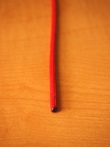 - keeping the ends of both cords lined up, stitch them together securely. trim the ends, keeping in mind that the toggle cap needs to cover the thread completely.