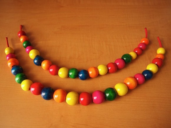 - check to make sure the beads have a clean hole drilled. if there are any splinters, they will snag the cord. i had to give all the beads a quick filing to make them smooth.