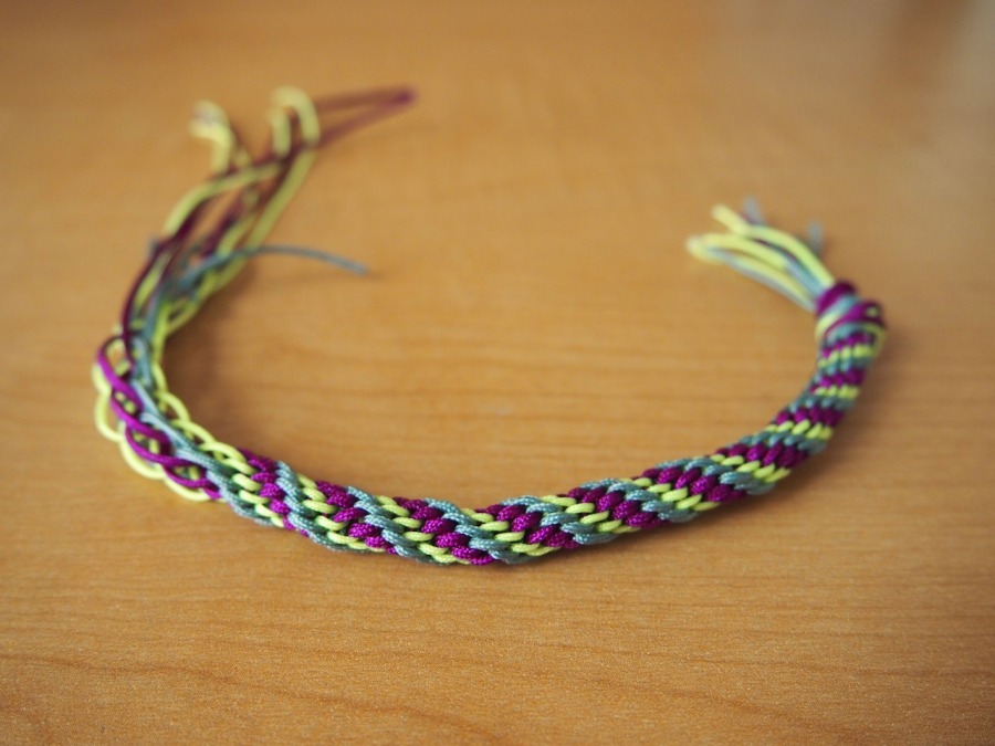 it's basically a beginners guide to kumihimo- the japanese art of braiding. there are a lot of online resources for patterns and instructions, so i looked up a simple diagonal stripe pattern (the diamond pattern that came with the kit wasn't thrilling me). the two color stripe was a little thin, so i added another color and was pleased with the results in cording.