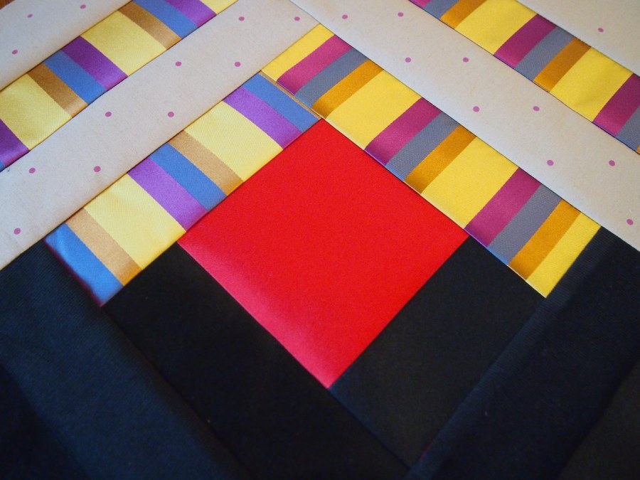 the last time i used this stripe it was with lilac and browns. this one had to look completely different, and i liked the last yellow/black combo, so i went that route again. the black satin is jersey backed (not by me), and it was a pleasure to work with. is that what i should've been backing satin with all along?