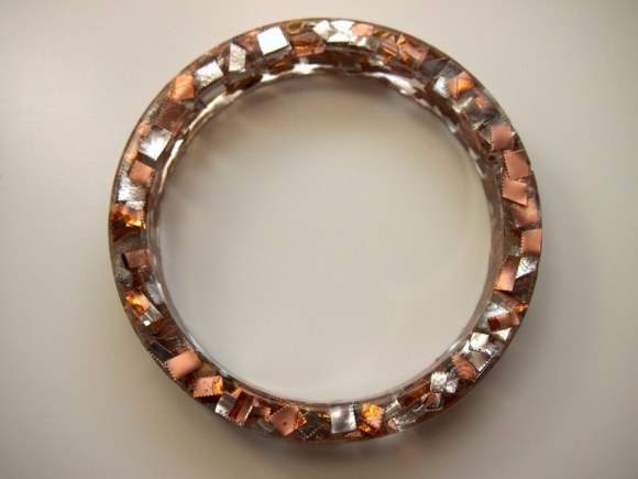 a skinny bangle mold covered in sparkles. a few of these ended up in the final product, so shame on me for being too lazy to clean it. after the initial addition of metallic trash to the resin, another handful was thrown in for good measure. past experience has taught that more isn't always better, but in this case, it turned out pretty great.
