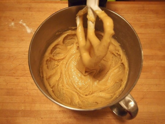- in the bowl of a stand mixer, beat eggs, oil, and extracts until smooth (i did this with a fork- it was faster than using an attachement on the mixer).