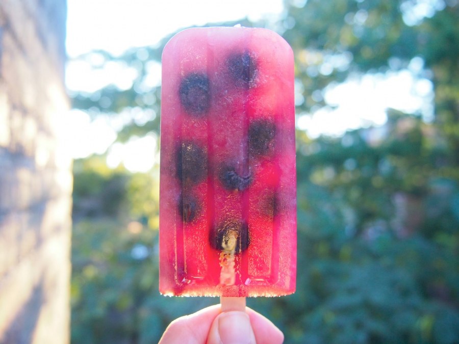 - fill a popsicle mold 3/4 with juice. add about 8 frozen blueberries to each cavity. cover with lid, but don't add sticks. freeze for 20-30minutes.