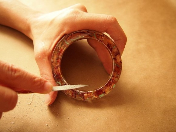 Almost all of the resin explorations from the last year are unfinished. The bangle size doesn't fit my wrist, so why bother? But the last bangle trial does fit, and it was a disaster out of the mold. A friend of mine suggested finishing the resin pieces with Micro-Mesh. I forked over for the NC-78-1 acrylic restoral kit which has 7 grades of sanding paper, a foam block, a bottle of micro gloss, 2 cotton flannel cloths, a bottle of anti static cream, and a bottle of detergent. Let's look at the problem area: