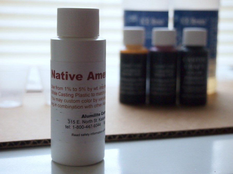 - Mixed 1 1/2oz resin. Added 4 drops amber pigment to 1/2oz clear resin. Added 6 drops amber and 1 drop native american pigment to 1oz clear resin.