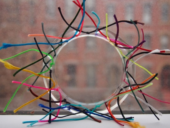 - cut 3" of nylon cording in multiple colors. tie a knot in the center.