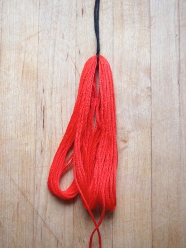 the last step is to flex a little needlework muscle and sew the fabric to the ribbon. use any fancy pants stitches you want. i went with a simple X in 2 colors. it was achieved by doing some diagonal stitches with the first color in one direction, then reversing the stitch with the second color.