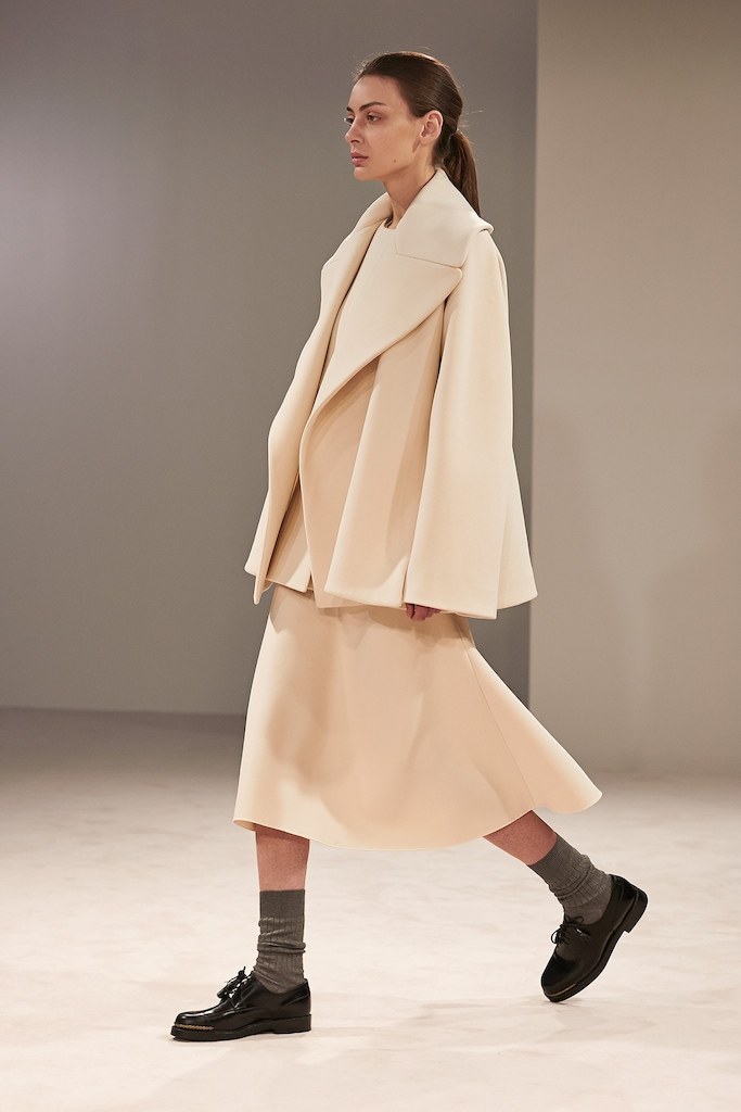 Mid-thigh. Drop shoulder. Bell-shaped/Loose fitting. Minimal. Large lapel. Hooded.