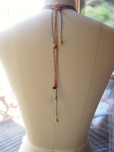 the strands holding these senoritas are very adjustable, so they can be worn together at different lengths and not smack into each other. it also creates the opportunity to do something cute on the back, and each strand has a little glass flower to finish it off.